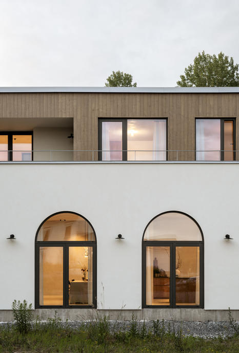 Villa Abdalian är ett hem där ljus, volym och taktilitet samspelar i ett stilla, nästan sakralt uttryck. Den putsade sockelvåningen med sina valvbågar bildar ett tydligt fundament mot skogsbakgrunden, medan den övre volymen i trä vilar ovanpå som en lättare träkropp. Den horisontella balansen mellan de två materialen ger huset ett tydligt arkitektoniskt avtryck, samtidigt som det förankras mjukt i omgivningen.